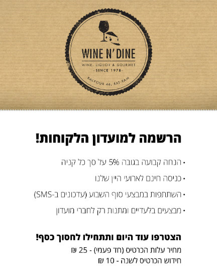 אצלנו ב WINE N' DINE אוהבים ומעריכים יין כבר קרוב ל- 40 שנה וככאלו , אנו מאמינים שקניית יין ומוצרי גורמה זוהי חוויה יוצאת דופן!